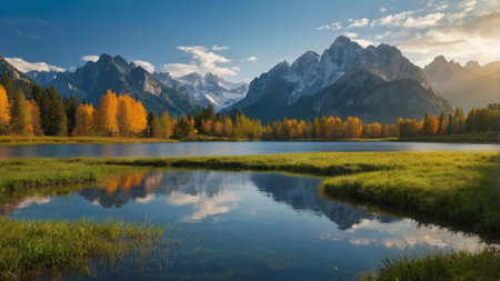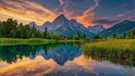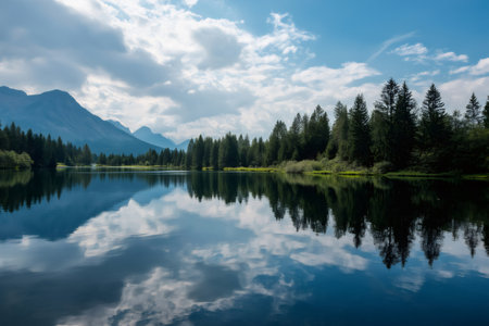 Captivating alpine landscape reflecting on the tranquil water surface of a serene lake, surrounded by majestic mountains and lush trees
