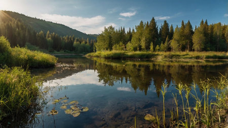 A stunning landscape featuring a mountain peak reflected in a tranquil lake, surrounded by tall trees and vibrant greenery, under a bright blue sky. Perfect for nature lovers.