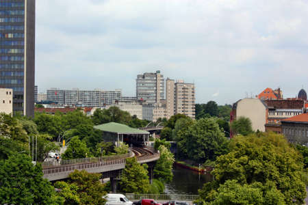 Berlin, Germany - May 30, 2013: Railway bridge over the river Landwehrkanal and Mockernbrucke station in Berlin