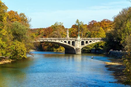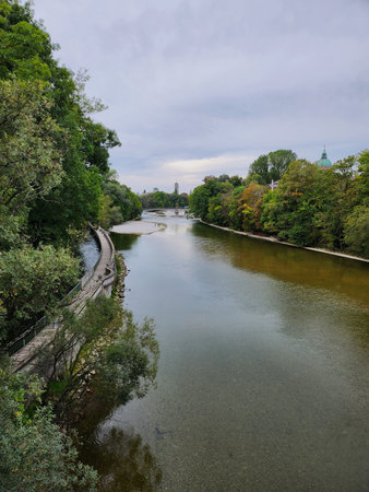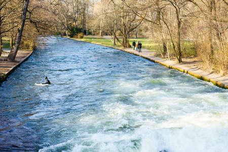 MUNICH, GERMANY - APRIL 4: The river Iasr flowing through Munich, Germany on April 4, 2018.
