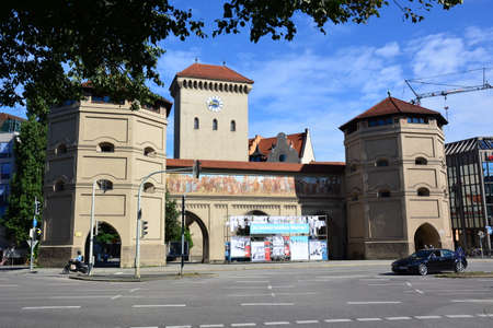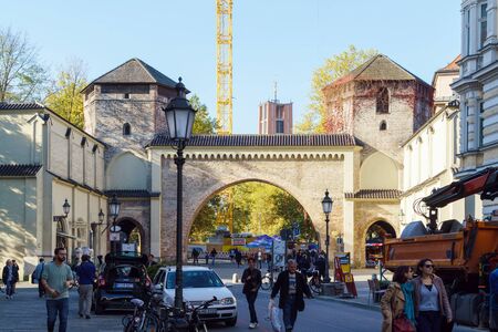 Munich, Germany - October 20, 2017: Sendling Gate or Sendlinger Tor, remainings of city wall, and retail stores in front of it