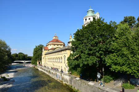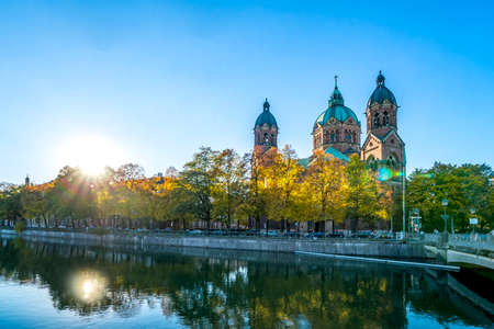 Isar river during the evening in Munich . View of Reichenbachbrucke and Kath. Pfarramt St. Maximilian