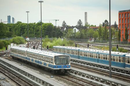 MUNCHEN, GERMANY - MAY 9, 2017 : A view of the railway with trains on the Frottmaning train station on the U6 subway line in Munich, Germany About 350 million passengers ride the U-Bahn every year.