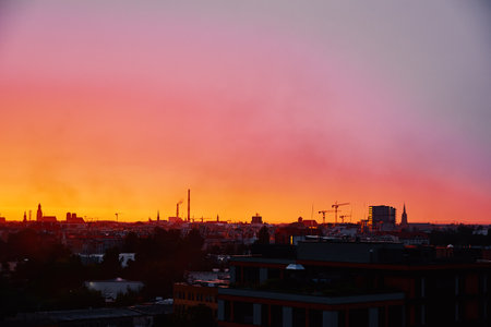 Dramatic sky at sunrise over Munich as panoramic aerial with a wonderful wide view over the bavarian capital city. View at the Frauenkirche in background.