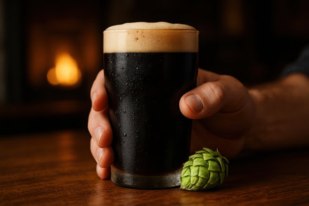 Man hand holds a frosted glass of dark stout beer with a creamy foam head, condensation, and a fresh green hop cone on a wooden table. cozy pub atmosphere.