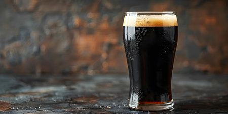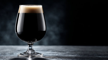A captivating image of a dark beer served in an elegant glass, featuring a frothy foam top against a textured dark background, ideal for beverage promotions.