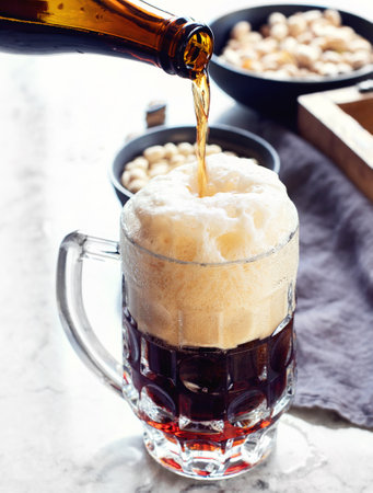 Enjoy a refreshing pint of dark beer, topped with a rich, creamy foam head, set against a vibrant bar background. Perfect for any occasion!
