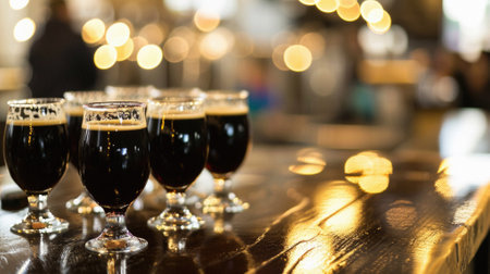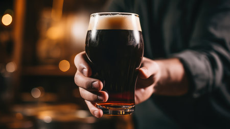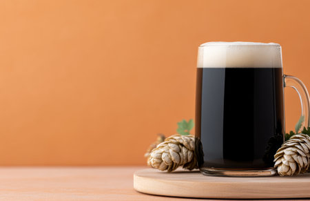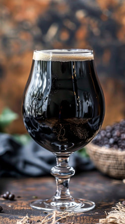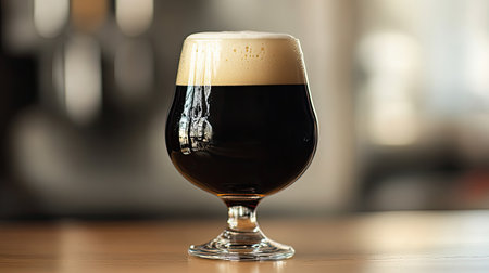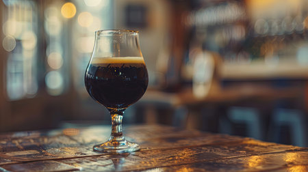Elegant glass of dark beer on rustic pub table with warm ambience