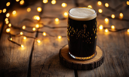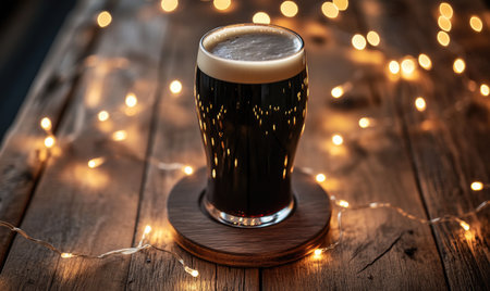 Pint of dark beer on wooden coaster, encircled by warm fairy lights