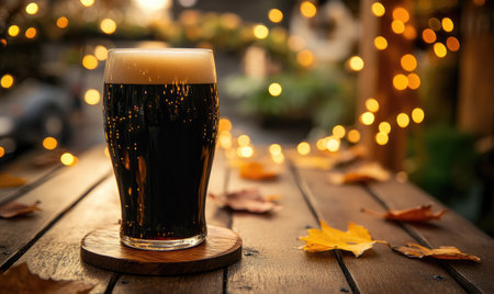 Pint of dark beer on wooden coaster, warm fairy lights, autumn leaves scattered