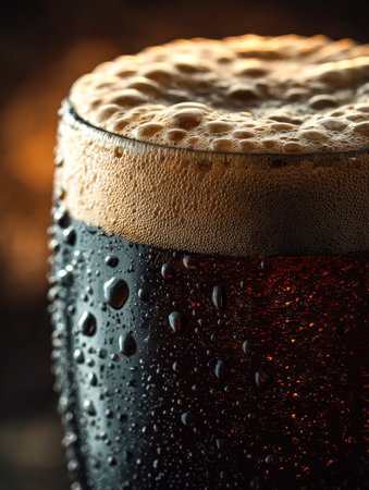 A chilled stout glass showcases a rich, deep hue topped with a thick, frothy layer, while tiny droplets slide down its cool, misted surface.