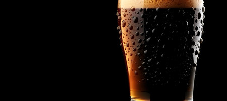 Close up of dark beer with drops of water on a dark background