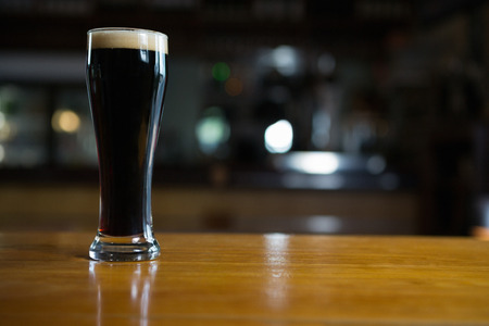 Glass of dark beer on a bar counter in a pub or restaurant