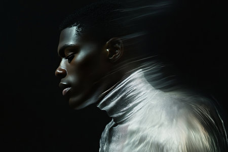 Dynamic fashion portrait of a young black male model in silver turtleneck against a dark background