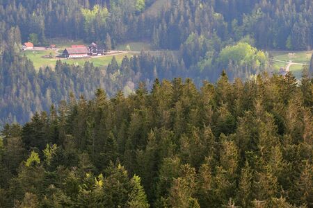 Landscape with coniferous forest and hills in the European forest of Schwarzwald, Germany. The concept of ecology, tourism