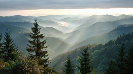 This breathtaking image captures misty mountains at dawn, showcasing layers of hills with soft light that create a serene atmosphere perfect for nature enthusiasts.