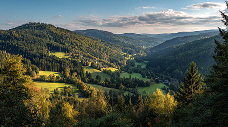 Panoramic view of the mountains in Waldorf, Germany, with green forests and a foggy valley below, against a clear blue sky. Captured using a Canon EOS R5. --chaos 20 --ar 16:9 --stylize 750 --v 7 Job ID: 339cb940-663f-4c48-8bb3-456c0e5659d5