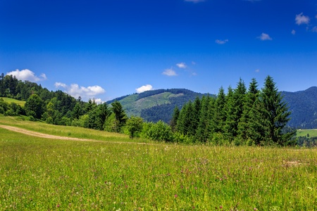 Landscape with green meadow and trees in the mountains under cloudy sky