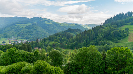Scenic view of a picturesque mountain forest in summertime with house on a meadow, Black Forest, Germany