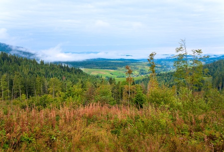 a landscape of the foggy morning forest at carpathian mountains, national park Skolivski beskidy, Lviv region of Western Ukraine