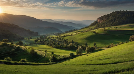 Generative AI : mountain meadow in morning light countryside springtime landscape with valley in fog behind the forest on the grassy hill fluffy clouds on a bright blue sky nature