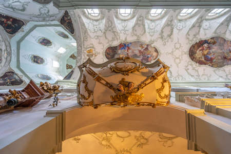 Upward view of rococo floral mural decorated pulpit inside St Peter Abbey church