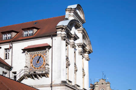 Poznan, Poland, April 30, 2018: View of the ancient clock on the wall of old building in the old city