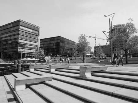HAMBURG, GERMANY - CIRCA MAY 2017: HafenCity quarter in the district of Hamburg Mitte on the Elbe river island Grasbrook on former Hamburger Hafen (Port of Hamburg) in black and white