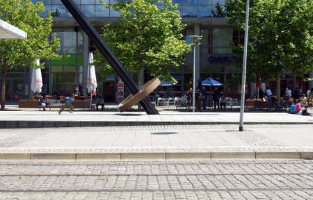 Magdeburg, Saxony-Anhalt / Germany - June 12, 2012: The station forecourt of Magdeburg on 11 August 2012. A modern, cone-shaped sculpture in the inclined position, a small black boy runs to it.
