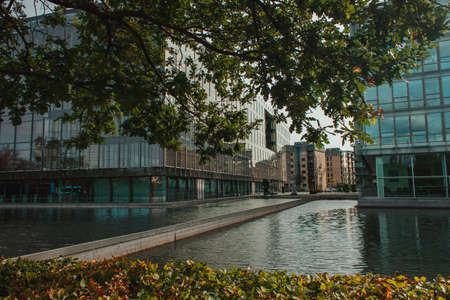 Selective focus of tree and bushes on walkway with buildings and canal on urban street, Copenhagen, Denmark