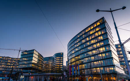 Vienna, Austria - October 30, 2019: Glass buildings of campus, business and bank with opened lights with dusk sky in the center of city at sunset.