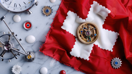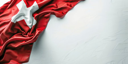 A vibrant Swiss flag draped elegantly over a white surface, highlighting its colors and iconic design. This image represents national pride and identity.