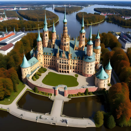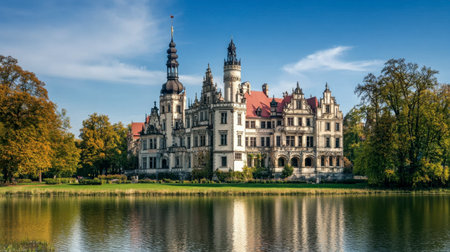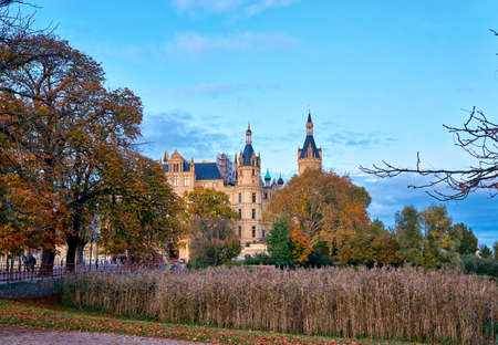 Schweriner castle seen from the park with water canals, reflections, sculptures and trees with colored foliage on a sunny autumn day, copy space
