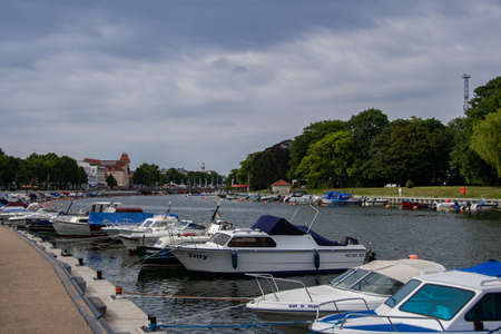 Wismar, Germany - May 8, 2023: Scenic summer outdoor view of the Old Port pier town architecture with ships and boats in Wismar, Germany