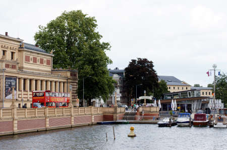 Schwerin, Germany - August 11, 2013 A red double-decker with vacationers taking a sightseeing trip along the Schwerin Castle Island on August 11, 2013 in Schwerin