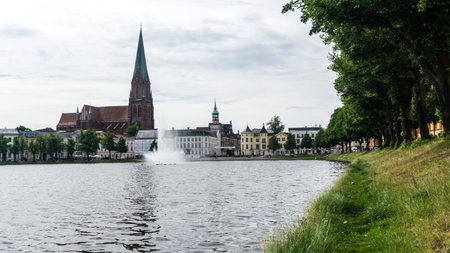 SCHWERIN, GERMANY - June 15, 2021 Pfaffenteich with fountain and cathedral of Schwerin in background