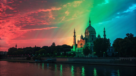 Colorful flowers bloom in the foreground while a majestic historical building stands in the background, surrounded by lush greenery and a bright sky.