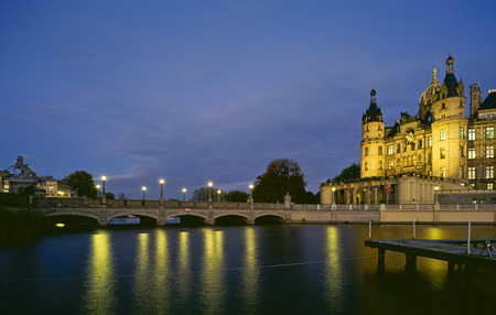 Schwerin, Germany. Views of the buildings of the Old Town reflected in the Schweriner See lake at dusk