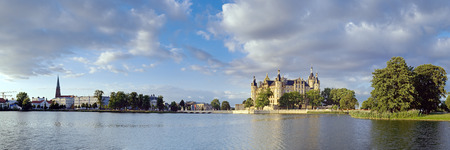Panoramic view of Schwerin Castle (Schweriner Schloss) reflected in the lake, Mecklenburg-Vorpommern state, Germany