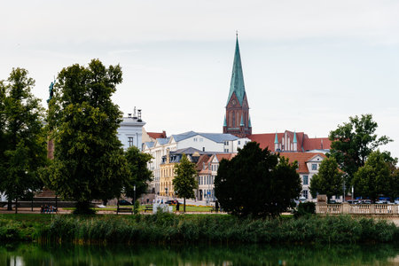 Cityscape of historic centre and Burgsee lake. Schwerin, Germany