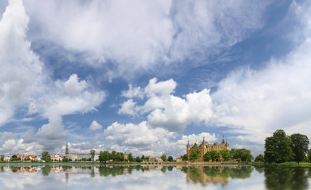Cityscape of historic centre of Schwerin and Burgsee lake, Germany. Long exposure