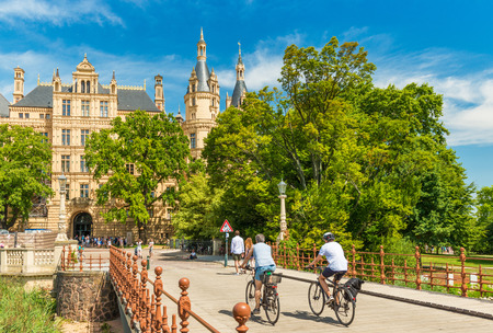 Schwerin - July 2018, Germany: Two cyclists moving towards the Schwerin Castle, the most famous landmark of the state of Mecklenburg-Vorpommern