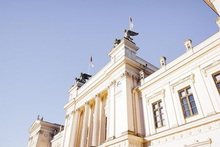 Lund, Sweden, October 20, 2016, Lund University main building in the sunshine. The facade with pillars against blue sky. On top is four sfinxs and two have laurel wreath