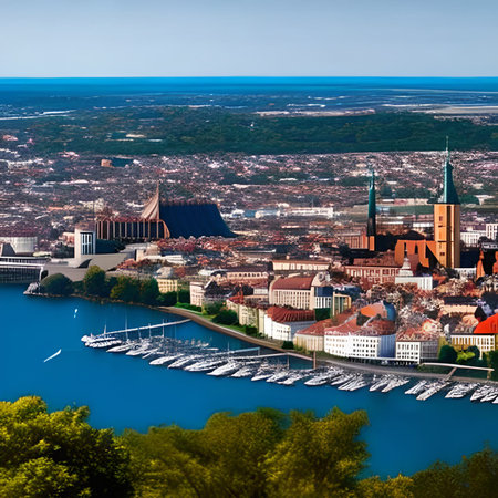 wideangle aerial sunset drone photo of the old city Kopenick Berlin, Germany where the rivers Dahme and Spree connect