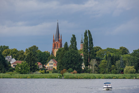 City lake with boat in front of the old town of Schwerin. Pfaffenteich lake.