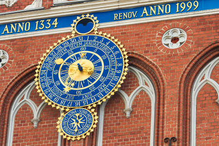 Golden astronomical clock on the building of the House of Blackheads in Riga, Latvia. The clock shows the time, day, month, and astrological sign