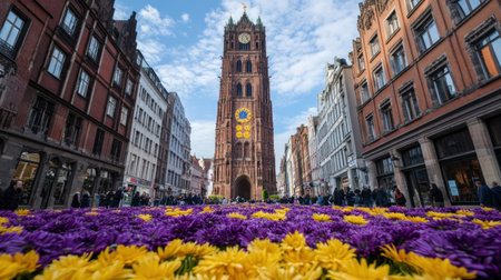 In the center of the street, initiate an interactive floral installation in front of Albrecht Dürer's tower, featuring purple and yellow chrysanthemums, surrounded by buildings decorated with flowers. The historic cityscape serves as the backdrop for visitors to take photos amidst the colorful blooms. Photography in the style of Canon EOS M50 Mark II. --chaos 30 --ar 16:9 --v 6.1 Job ID: 66b05ada-980c-44ae-9fdc-6e58bb2036ff