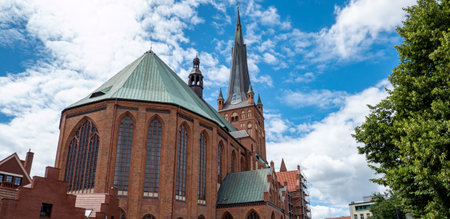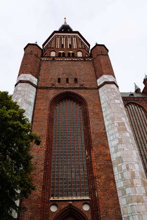 Exterior view of St. Mary Church in Stralsund. Low angle view of the main facade