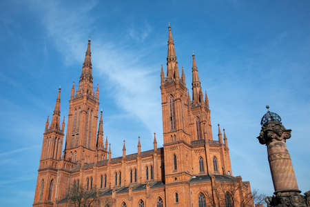 market church in Wiesbaden with historic market pillar from 19th century with fountain under blue sky
