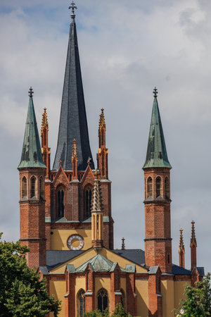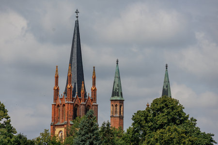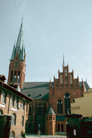 Aerial panorama Basilica Saint Anthony Rybnik, Poland, urban landscape, horizontal orientation, neo-Gothic brick, twin spiers, daytime, tourism, cityscape, cultural heritage use